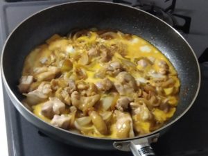 作り方はたまねぎと鶏肉を切って煮て、たまごを入れて完成。